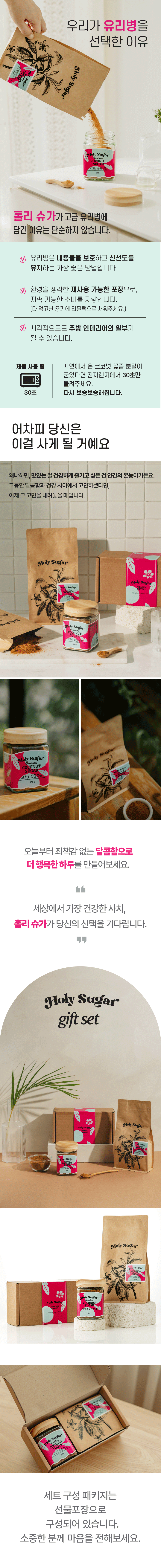 건강한 단맛!자연 그대로의 건강한 단맛, GI지수 35,백설탕의 1/3 수준의 코코넛 꽃즙과감성적인 패키지가 만난 홀리슈가 선물세트.